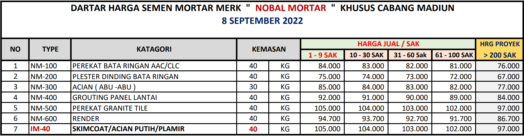 HARGA NOBEL MORTAR AREA MADIUN, MAGETAN, NGAWI, PONOROGO